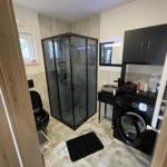 Modernes Badezimmer: Hochwertige Armaturen, eine geräumige Dusche sowie frische Handtücher und Pflegeprodukte sorgen für zusätzlichen Komfort.